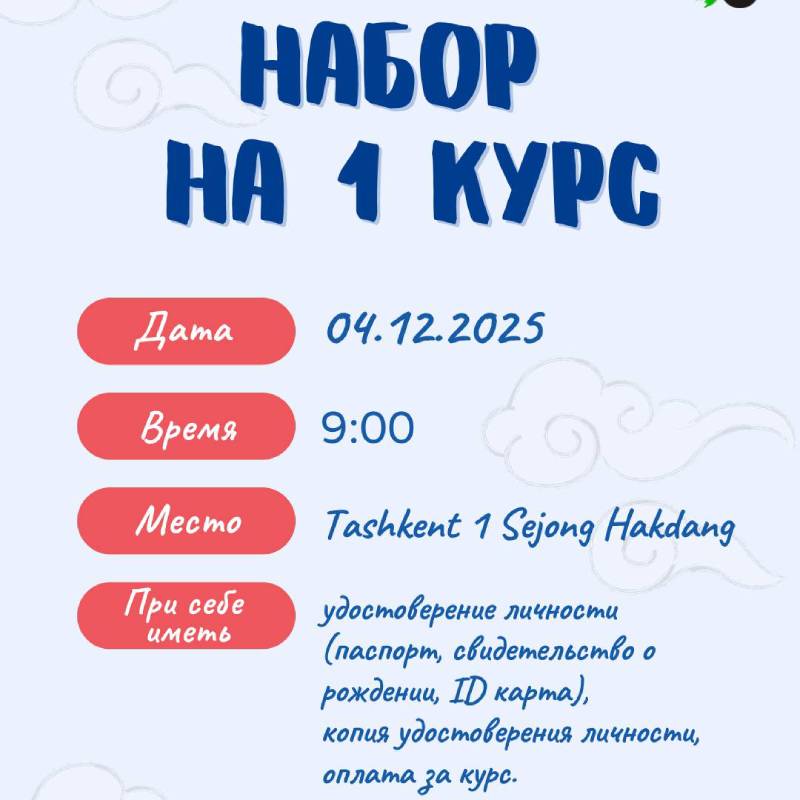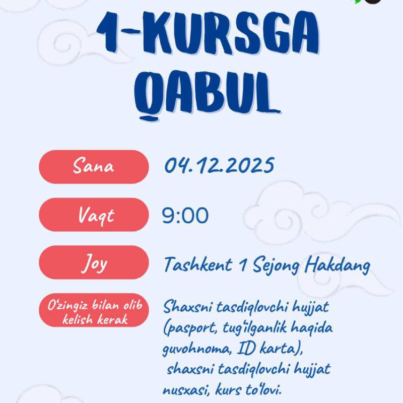 Agar siz ilgari koreys tilini o’rgangan bo’lsangiz va boshlang’ich 1-kursda qayta o’qishni istamasangiz, ofisimizga (71)256-57-54/ (93)007-16-16 raqamiga qo’ng’iroq qilib, imtihonga yozilishingiz mumkin.