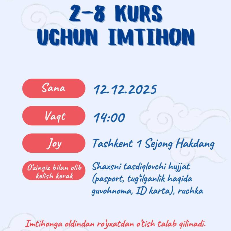 Imtihon 듣기, 읽기, 쓰기, 말하기dan iborat bo’lib,12 dekabr kuni bo’lib o’tadi.