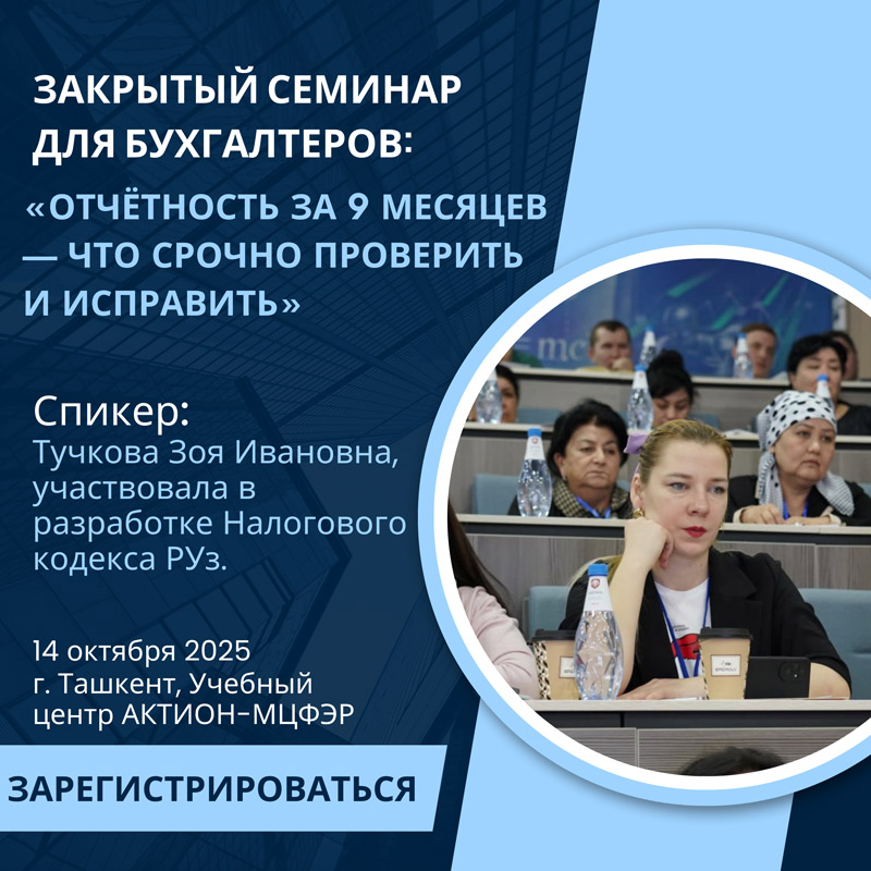 ✨ Спикер: Тучкова Зоя Ивановна — налоговый эксперт, более 20 лет опыта работы в Государственном налоговом управлении г. Ташкента, участник разработки Налогового кодекса, преподаватель в Национальной ассоциации бухгалтеров и аудиторов и Палате аудиторов РУз. ✔️ Дата: 14 октября 2025 года ✔️ Время: 10:00 (Ташкент)