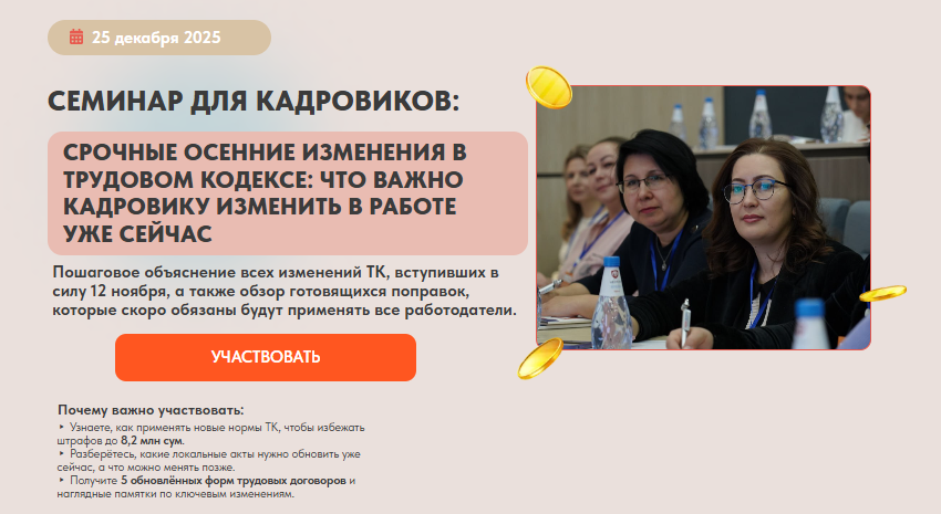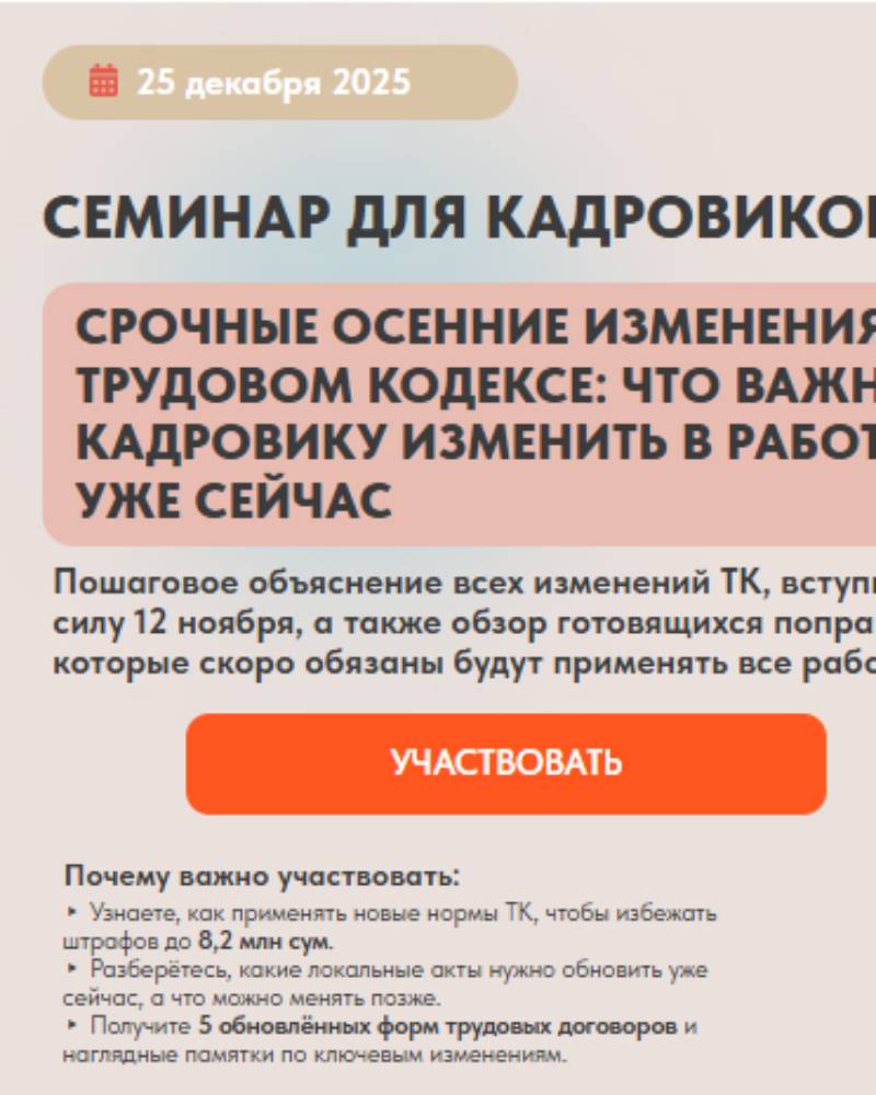 Почему это важно именно сейчас: 1. ТК менялся несколько раз в течение года, и из-за частых корректировок легко ошибиться – а за нарушения штрафы доходят до 8,2 млн сумов. Особенно много вопросов вызывает: • отмена ограничения в 120 часов сверхурочной работы в год; • новые правила оплаты: 1,5× за первые два часа и 2× далее; • обновленные требования по приему на работу новых сотрудников; • необходимость пересматривать локальные акты компании; • ожидаемые изменения, которые вступят в силу в 2026 году.